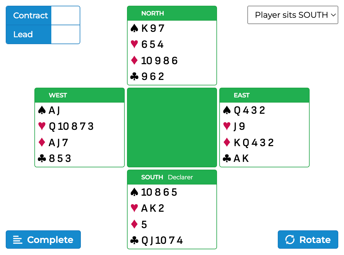 Rotate the hands by the button Rotate Hands at the bottom right. Enter a partial diagram and then complete the hands randomly by using the button Complete at the bottom left.
