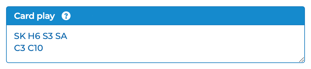 Each trick (complete or not) is entered on a single line. Cards are indicated by the symbol of their suit (S for s, H for 3, D for 4 and C for c) followed by their value (A, K, Q, J, 10… 2).