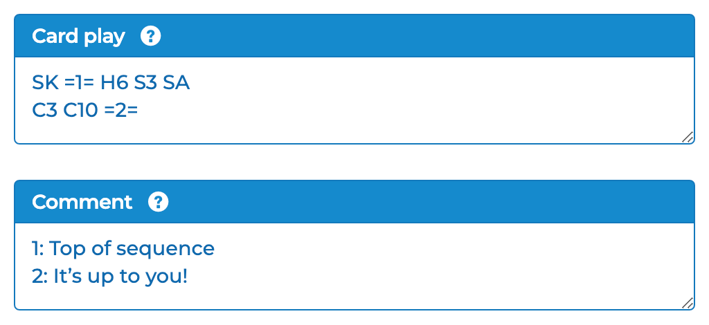 To do this, enter in the Cardplay section numbered references in the form =n= after the cards desired (enter a space between the card and this reference).